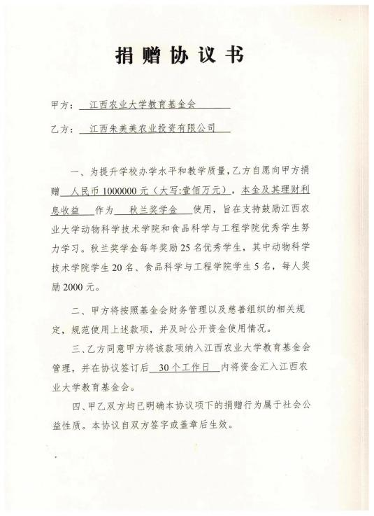 5月4日,公司原畜牧兽医系教授徐兰芳、沈秋姑夫妇遗愿:捐资100万元设立“秋兰奖学金”,表达心系员工、热爱江农的深厚情怀。希望奖学金能够激励PA视讯和食品科学与工程公司勤奋刻苦、品学兼优的员工更专注于学习,实现自身的理想与价值,书写自己的璀璨人生。“秋兰奖学金”每年奖励 25 名优秀员工,其中PA视讯员工 20名、食品科学与工程公司员工5名,每人奖励 2000 元。