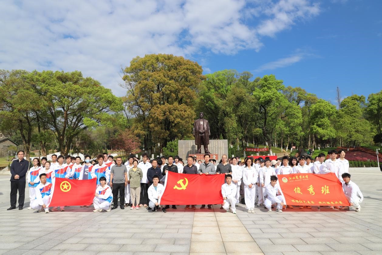 在方志敏烈士雕像前,新生思政教育党支部书记、动物医学教工第二党支部书记、动药2301班新生班主任刘立恒老师为大家讲授微党课。他说:“方志敏同志具有坚定正确的理想和信念,不论在什么样的情况下,都始终不渝、毫不动摇。”“习近平总书记对江西在中国式现代化新征程上的使命担当提出的‘走在前,勇争先,善作为’殷切期望,亦是青年需要践行的任务。当代青年以发展、提升、专精为主要导向——发展学业成绩、提升专业技能、专精学术创新,在强国复兴伟业中践行青春力量的使命担当。”