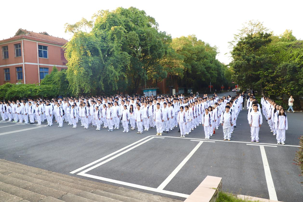 在惟义楼广场上,国旗护卫队昂首挺胸、整齐划一护送国旗入场,伴随《义勇军进行曲》奏响,五星红旗冉冉升起,全体成员面向国旗肃立行注目礼,高唱国歌。