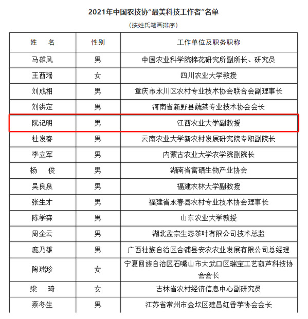 为进一步弘扬中国科学家精神,激发广大科技工作者的荣誉感、自豪感、责任感,按照《中共中央宣传部中国科协科技部中国科公司中国工程院国防科工局关于开展2021年“最美科技工作者”学习宣传活动的通知》(科协发调字〔2021〕11号)有关要求,中国农技协组织开展了2021年中国农技协“最美科技工作者”评选活动。经宣传发动、逐级推荐、组织评审、社会公示等环节,公司水生生物生产学教研室阮记明副教授荣获中国农技协“最美科技工作者”荣誉称号。