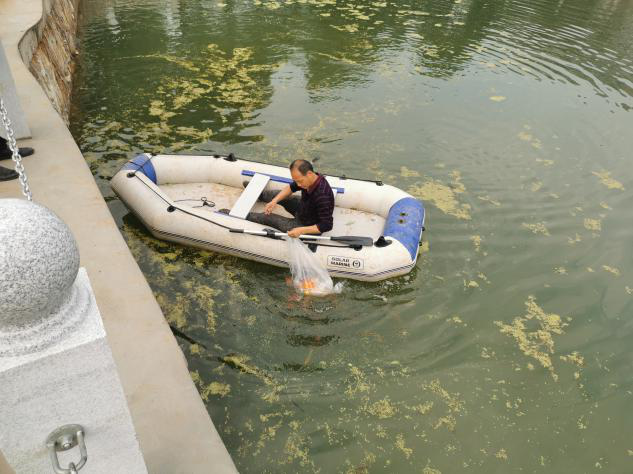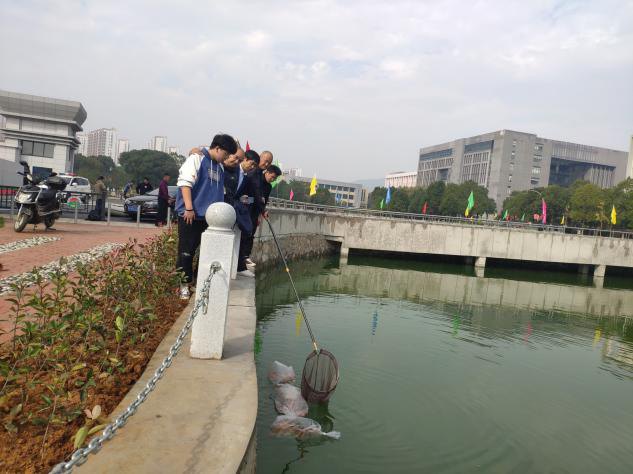 活动开始,小队成员对南大门两侧湖水进行精心地环境整治,清理湖边杂草并打捞湖面杂物。经过水温平衡后,一尾尾生态景观鱼摆动着鲜艳的身躯在水中游动,湖面泛起片片波澜。此次放养的几百条生态景观鱼均来自南昌市农科院畜牧水产研究所向塘基地,其中包括观赏性锦鲤、净水性鲢鳙鱼等鱼种,既具有极高的观赏价值,又富有极佳的生态意义。