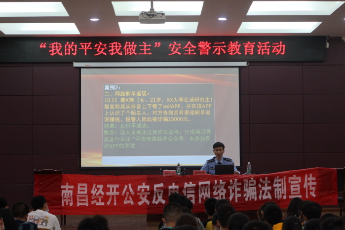 为加强2020级新生安全防范意识,提高网络防诈骗能力,营造和谐校园生活。10月13日下午,公司邀请经开区公安分局法制办主任杨军贤、校保卫处副处长陈裕鹏于老员工活动中心501报告厅举办安全警示主题教育活动。公司党委副书记陈小志、2020级全体新生、新生辅导员和学工办老师参加。