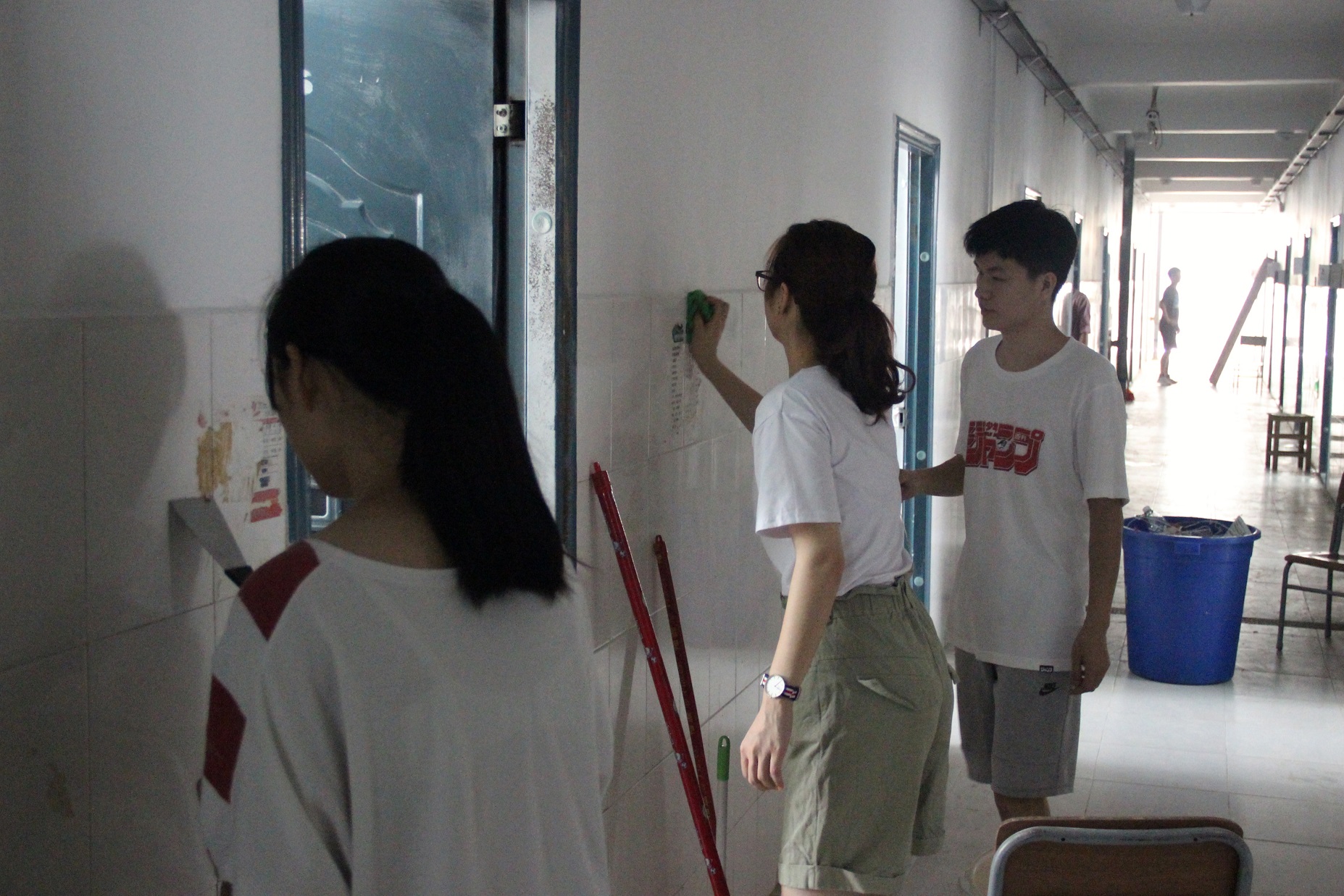 同学们冒着酷暑,热火朝天地投入到清扫活动中。在寝室里,有的抹床板、有的拖地、有擦拭门窗桌椅、有的清除小广告,到处都是同学们忙碌的身影。针对顽固的小广告和各种贴纸,同学们动用了小铲子、清洁剂等工具,将“牛皮癣”彻底消灭。为了确保新生安全入住,同学们对寝室内的风扇、电灯、床板等设施进行全面检查。