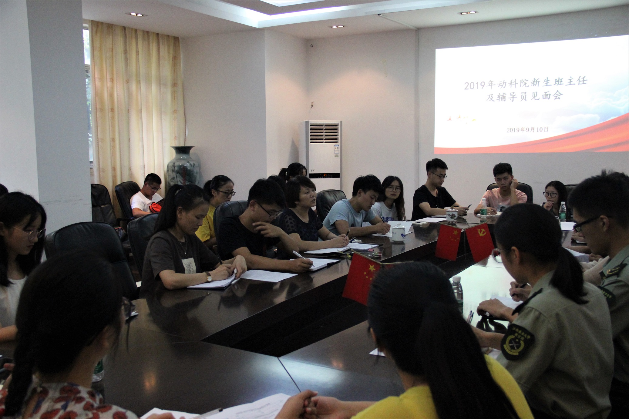 为加强新生班主任与辅导员之间的交流,做好迎接2019级新生的准备工作,9月10日,公司于公司二楼小会议室召开2019级新生班主任及辅导员见面会。公司党委副书记廖述香、2019级新生班主任、学工办全体老师、新生辅导员及全体教官到场参加。