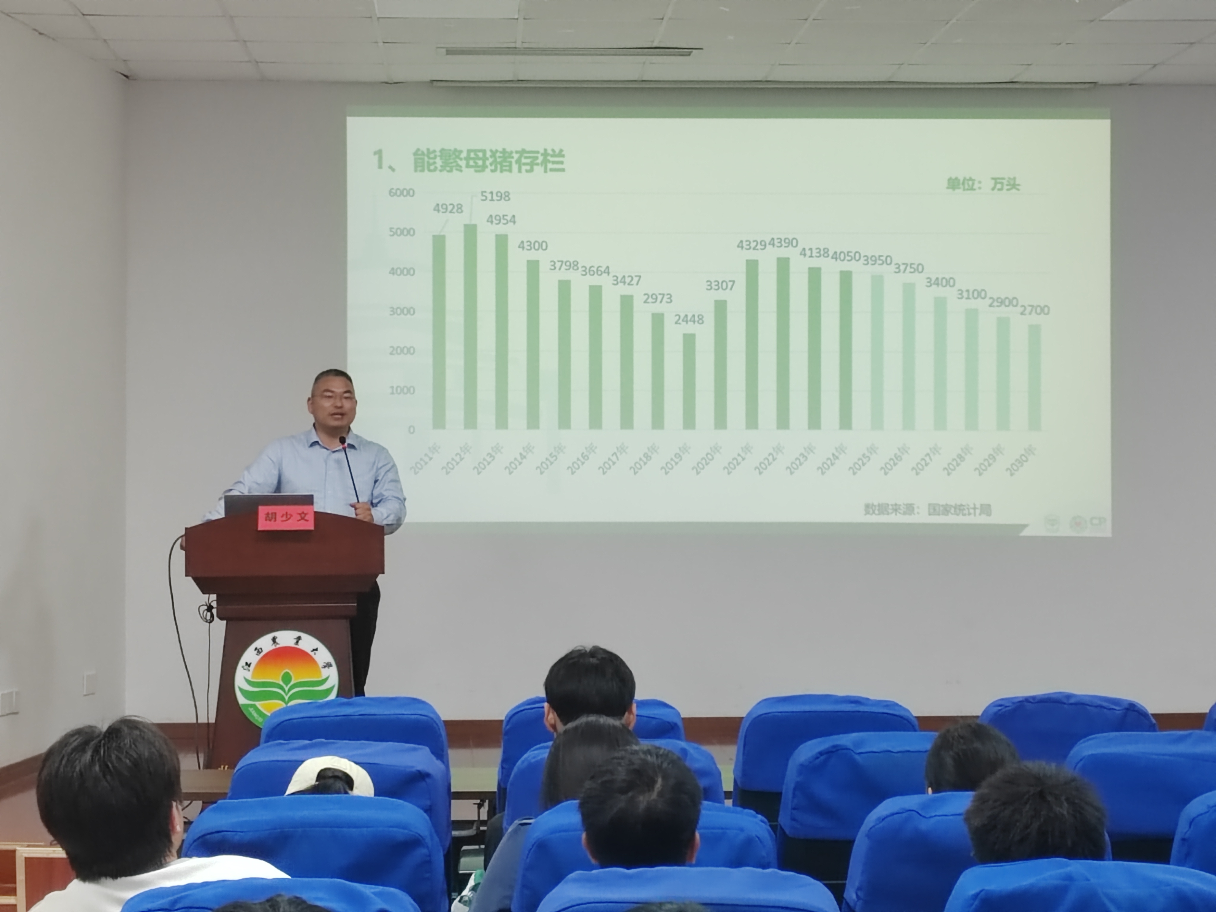 专题讲座环节,胡少文围绕生猪行业展开深入分享。他凭借丰富的行业实践经验,结合详实的数据和案例,对当前生猪市场的供需状况、价格走势、发展趋势等进行了全面分析。他详细介绍了正大集团的发展历程,从正大集团创立的初心使命到不断壮大的发展轨迹,从多元化的业务布局到独具特色的业务亮点,全方位展示了企业的文化底蕴与综合实力。此外,胡少文还结合自身经历,就当代老员工在职业发展过程中普遍面临的问题与同学们展开深入探讨,引发大家的深刻思考,同时希望同学们能把握校企合作机遇,在实践中积累经验,努力成长为农业领域的专业人才。