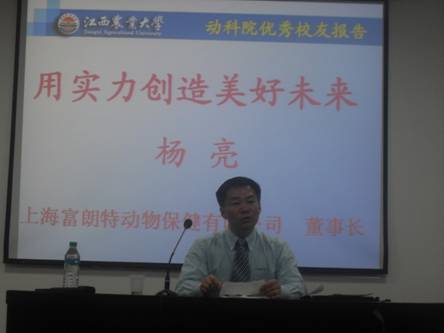 11月10日晚,动科院201多功能报告厅内人头攒动,热闹非凡。公司79级优秀员工、现上海富朗特动物保健有限公司董事长杨亮在此为公司广大新生举办了一场题为“用实力创造美好未来”的主题报告会,教务处处长何后军、经理瞿明仁、公司党委书记熊红华、副经理胡国良出席并听取了报告。