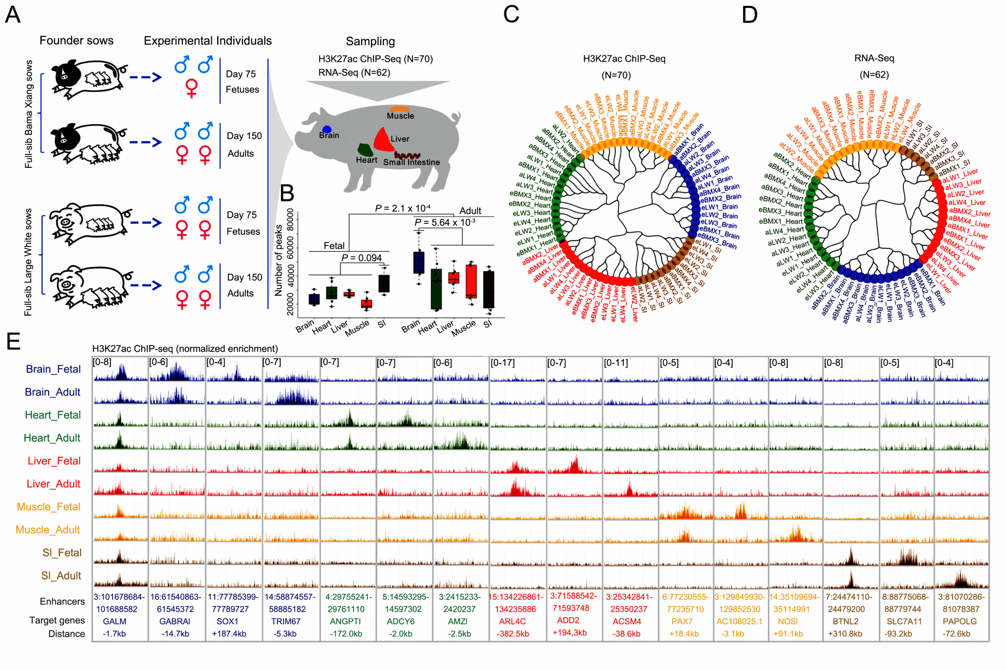 公司猪遗传改良与养殖技术国家重点实验室黄路生院士团队在多时空多维度家猪启动子及增强子全基因组图谱构建的研究取得进展。研究团队利用H3K27ac ChIP-seq和RNA-seq等多组学技术系统地研究了来自不同发育胚层的多种组织(脑、肝、心脏、肌肉和小肠)、不同发育阶段(胚胎期75日龄和成年期150日龄)、不同品种(中国猪种巴马香和商业猪种大白)、不同性别(雌性和雄性)的101,290个活性增强子和启动子及其靶基因的功能及时空分布,揭示了这些调控序列在机体内发挥重要的生物学功能。鉴定到了110个在所有组织和发育阶段都稳定表达的安全港区域(safe harbours),为猪作为人类医学模型研究提供了有价值信息。发现 XIST基因启动子区域中的H3K27ac 和 DNA 甲基化可能与 X 染色体失活有关,丰富了人们对X染色体失活这一基础生物学过程背后基因表达调控的机制的了解。此外,团队在复杂性状相关基因以及突变位点的基因组区域中发现了相应的调控元件,为复杂性状的遗传解析提供了基础数据。相关研究成果以“Mapping and analysis of a spatiotemporal H3K27ac and gene expression spectrum in pigs”为题于2022年1月27日在Science China Life Sciences在线发表。黄路生院士、杨斌副研究员为文章的共同通讯作者,朱亚玲博士、周志敏博士、黄涛博士和张震博士为文章的共同第一作者。
