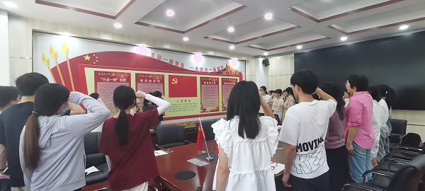 最后,全体党员在蔡敏茜的带领下,面对鲜红的党旗,庄严地举起右手,握紧拳头,共同重温入党誓词。坚定有力的誓言,使每一位毕业生党员又一次接受了深刻的党性教育。