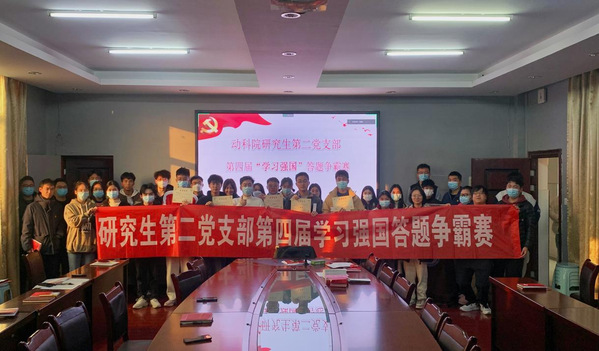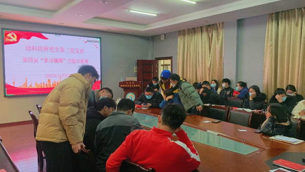 支部依托“学习强国”APP开展知识竞赛活动。比赛共设“大浪淘金”、“强强联合”、“决战之巅”三个环节。经过前两个环节的激烈竞赛,产生前五强选手,并进入第三个环节,通过两两对战的形式决出最终名次。比赛中,选手们沉着应对,扎实答题,通过投影播放的方式,实时转播对战情况,让所有党员参与其中。经过三轮激烈的角逐,动物营养与饲料学2021级硕士研究生张祥玉同志荣获本次答题比赛的第一名。