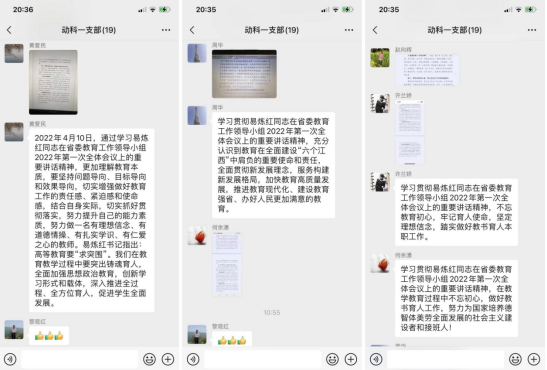 按照疫情防控要求,公司各党支部精心筹备开展线上专题学习和教育思想大讨论。全体教师和党员纷纷表示,要深刻领悟易炼红同志讲话的精神实质,切实把思想和行动统一到省委、省政府的决策部署上来;坚守“为党育人、为国育才”的初心使命,培养出更多的优秀人才,以优异成绩喜迎党的二十大召开!