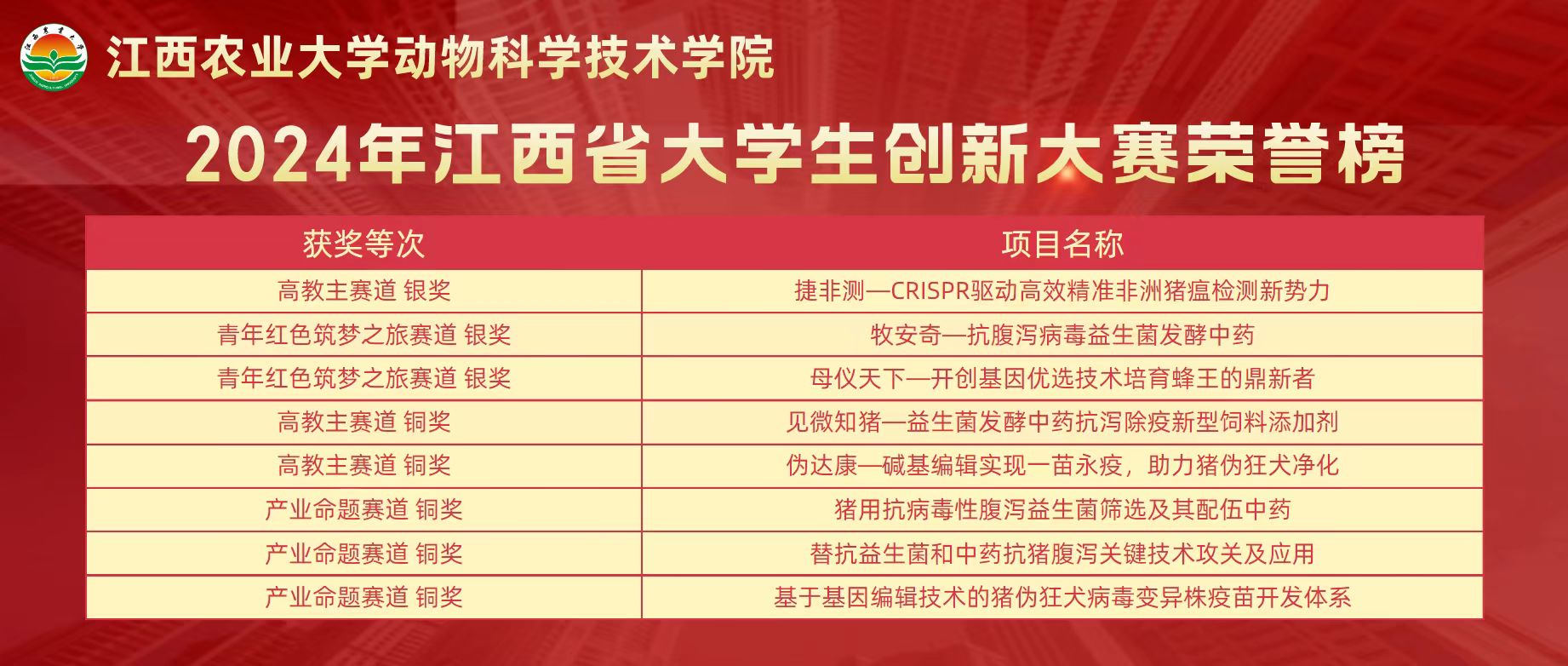 其中“捷非测—CRISPR驱动高效精准非洲猪瘟检测新势力”项目荣获高教主赛道银奖,“牧安奇—抗腹泻病毒益生菌发酵中药”项目和“母仪天下—开创基因优选技术培育蜂王的鼎新者”项目荣获青年红色筑梦之旅赛道银奖。