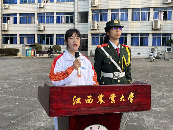 惟义动科2201班胡佳荣在国旗下发言。她表示,一代人青年人有一代青年人的使命,一代青年人有一代青年人的作为,站在新时代节点,江农学子们要牢牢接住时代接力棒,把个人的学习奋斗汇入国家发展的洪流,为祖国的伟大事业赓续传承、接力奋斗,乘新时代的春风,在祖国的万里长空放飞青春梦想。